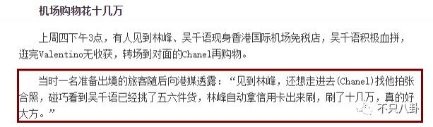 有媒体曾报道,在免税店,吴千语积极血拼,林峰一次刷卡十几万,都不眨眼的!