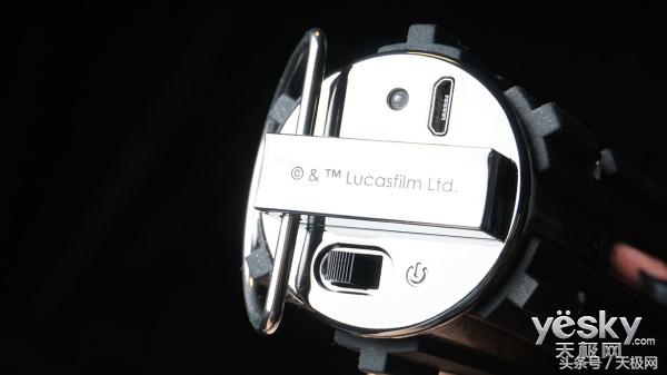 联想Mirage的光剑控制器细节很丰富,可以说控制器本身就是不可多得的周边产品。光剑控制器底端包括指示灯、充电接口以及开关。同时中间还印有Lucasfilm Ltd认证标示,所以光剑品质是绝对有保障的,比如开发人员也有特别提到,包括光剑下方橡胶垫的阻尼都有严格的要求。