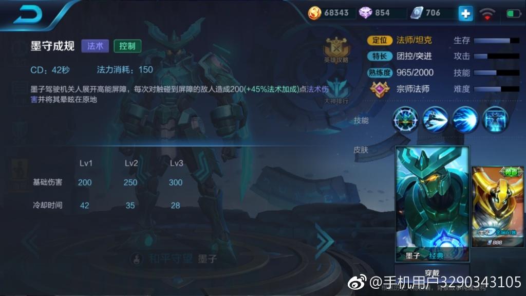 5.墨子前期非常弱,强在后期法术加成高,所以前期请不要想着去杀人,猥琐发育猥琐发育猥琐发育 重要的事情再说三遍 。