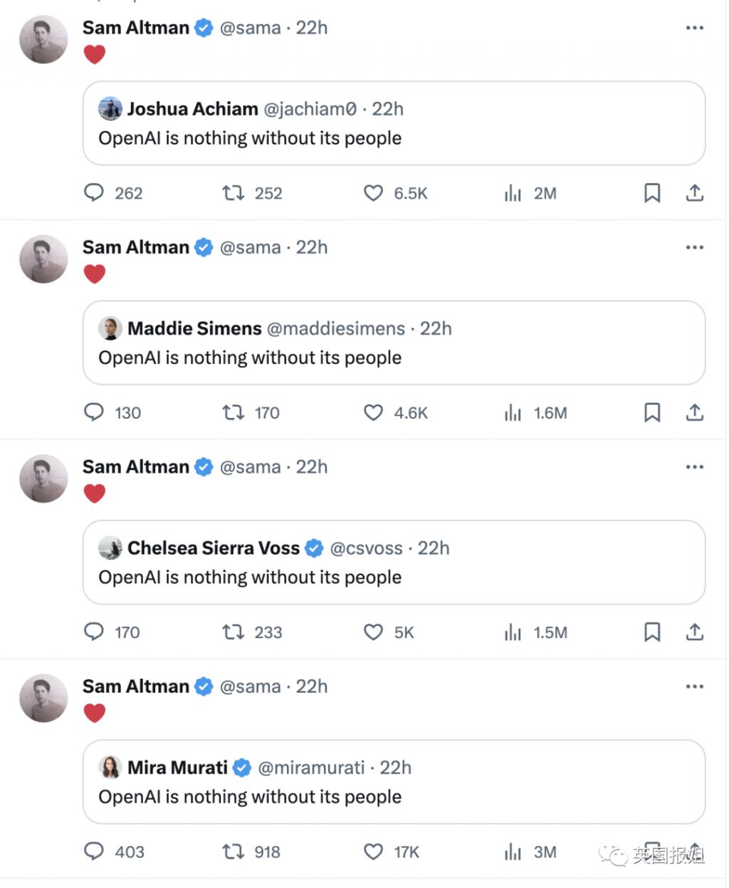 20 日凌晨,众多员工在 X 上为这位前老板的新机会而兴奋。他们写下:没有员工,OpenAI 将一无是处。