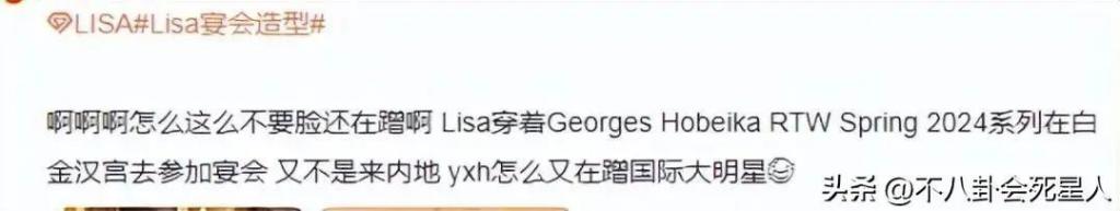 但是,毋庸置疑的是疯马秀对 Lisa 并没有多大的影响,因此她的粉丝还在嘲讽称,内娱即使骂得再凶,Lisa 也依然穿着高奢礼服,在白金汉宫美美参加宴会。