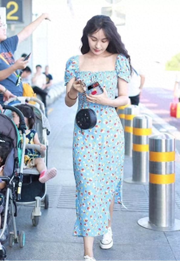 李菲儿这套碎花裙穿搭真的是仙气十足,蓝色碎花长款连衣裙让她的好身材展露无遗。裙子的设计也很巧妙,胸口处为低胸一字领,加上泡泡袖,若把袖口拉平,还能穿出露肩的效果。裙子虽然没过小腿肚,但是裙角处的开叉,则给裙子带来了一些灵动的感觉。除了这套裙子之外,她的脚上穿了一双白色休闲布鞋,手上则拿了一个黑色手提小皮包,除此之外,就没有过多的装饰了。但是裙子上的红白小碎花,却和鞋子非常的相呼应,显得衣服并不是特别的平淡无味,那么身材较为不错的妹子们,也可以进行这样的尝试。