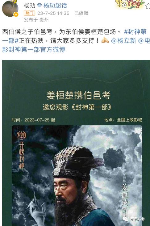 《封神》刚上映那会,杨玏还以片中角色西伯侯之子伯邑考的名义为杨立新角色东伯侯包场 ↓