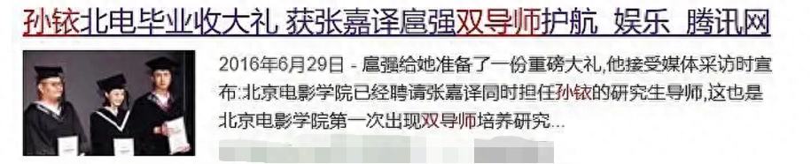 据悉2016年6月,毕业于北京电影学院的孙铱,不仅成为该届唯一一个被保送的研究生,而且还成为北电有史以来第一个获双导师培养的研究生。从当时的报道中可以看到,北电研究生导师扈强在接受采访时宣布,学校已聘请张嘉译同时担任孙铱的研究生导师。
