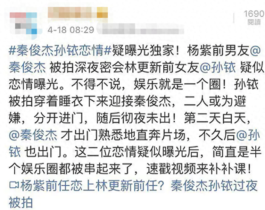 此外从网友晒出的另一张截图中可以发现,2019年4月18日媒体也曾爆料过孙铱与杨紫前男友秦俊杰的绯闻,据悉当天秦俊杰被拍到深夜现身孙铱楼下,而孙铱则穿着睡衣下楼迎接,或许是为了避嫌,两人分开进门随后彻夜未出,直到第二天秦俊杰才现身直奔片场。