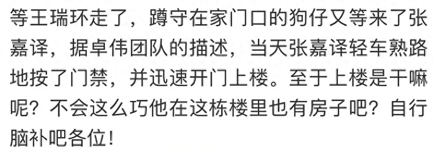 据该媒体所述,等王瑞环离开后,张嘉译也意外现身孙铱楼下,当天他轻车熟路地按了门禁卡,并迅速开门上楼,至于是上去干了什么,又或者张嘉译是否碰巧在这栋楼里也有房子就不得而知了。