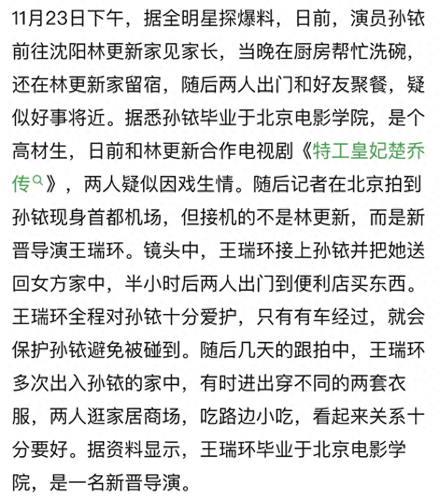 从这位网友晒出的截图中可以看到,2016年11月就有媒体爆料,此前合作过电视剧《楚乔传》的孙铱与林更新疑似因戏生情,而孙铱更是被拍到前往沈阳林更新家中见家长,当晚在厨房帮忙洗碗并留宿,随后又和男方一同出门与好友聚餐的画面。