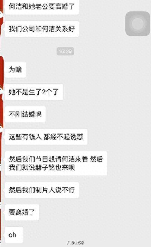网友爆料称,节目制作方想邀请何洁与老公赫子铭共同参加节目时,却因为离婚问题被告知无法共同现身,有钱人经不起诱惑,疑似双方有一人出轨。两人的微博也确实能窥出一些端倪,最近一个月都无互动,何洁最近正忙着演唱会的彩排,但看起来每天都是自己独自接送孩子的感觉,周末都要带着孩子工作!对此传闻,何洁和郝子铭双方都表示‘没有离婚,也没有出轨’但是离否则没过几天就有更多的料被曝出来···