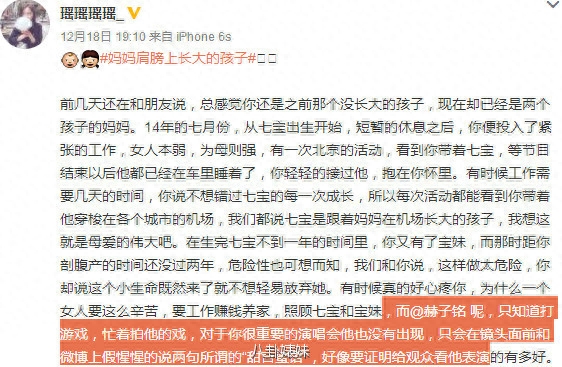 12月16日,离婚传闻愈演愈烈,赫子铭好老公、好父亲人设也完全崩塌,不仅被指吃软饭,不管小孩只打游戏,居然还被指‘嫖娼’。然后,何洁的歌迷开始控诉赫子铭:忙于拍戏没能到何洁的演唱会、还常常不管孩子只顾打游戏,而何洁生完大儿子七宝之后,不顾生命危险,过了仅仅半年就又剖腹产生下女儿,盒饭们对何洁心疼不已。