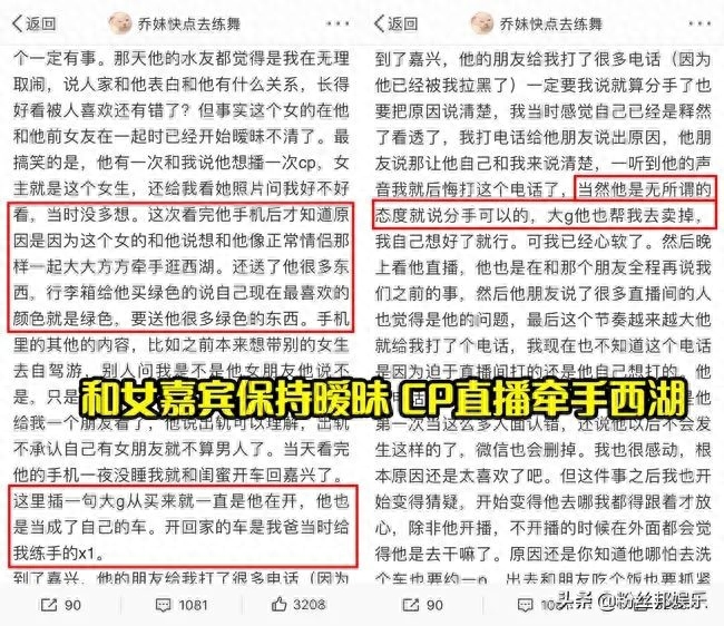 乔妹在文中透露当时独自和闺蜜开车回嘉兴的事情,小小酷哥一直和一位女嘉宾保持暧昧来往。