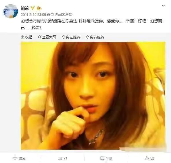 2011年2月,姚笛在社交平台更新了一条动态:幻想着每时每刻都能陪在你身边,静静地欣赏你、感受你......幸福!好吧!幻想而已。