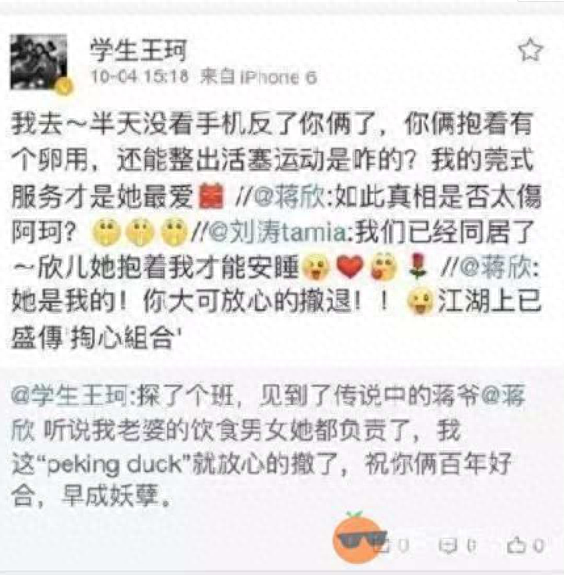 在那一年,王珂在探班完刘涛后,他直接用“活塞运动”和“莞式服务”粗俗不堪的词语来发微博开刘涛和蒋欣的玩笑。