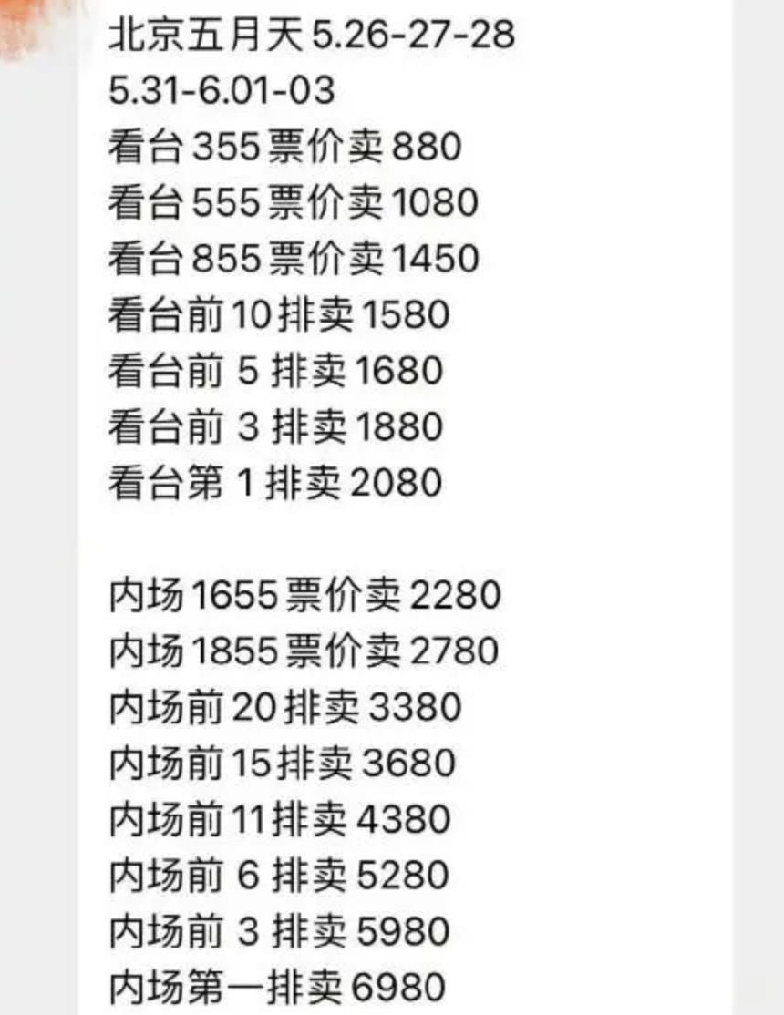 北京演唱会,原价 355 元的看台票卖到 900;而原本 1855 元的内场票,最高定价超 8000 元。