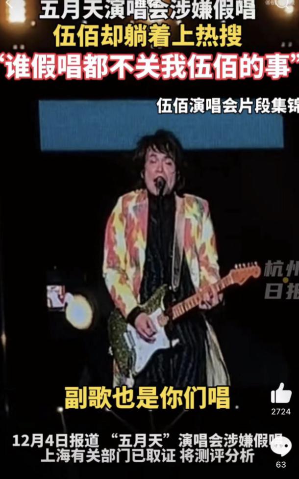 伍佰演唱会,他说 " 主歌你们唱,副歌你们唱 ",网友调侃,伍佰只是到现场就能把钱挣了,说谁假唱都说不到他。