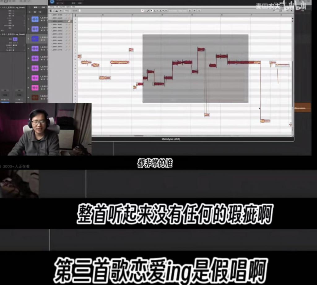 这一鉴定不要紧,这位 up 主找了粉丝发在网上的演唱会现场视频,提取人声部分,用软件与录音室版本做对比。注意 up 主说的 " 有瑕疵 ",是指与录音室版本不同。因为现场无法做到像录音室版本那样完全稳定。所以 up 主认为与录音室版本完全一致的话,就算 " 假唱 "。