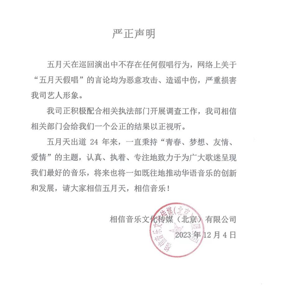 之后五月天经纪公司否认假唱,并表示积极配合相关部门展开调查。