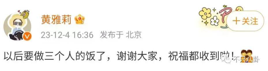 消息传开后,黄雅莉也没藏着掖着,大大方方地官宣了喜讯:以后要做三个人的饭了,谢谢大家,祝福都收到啦!
