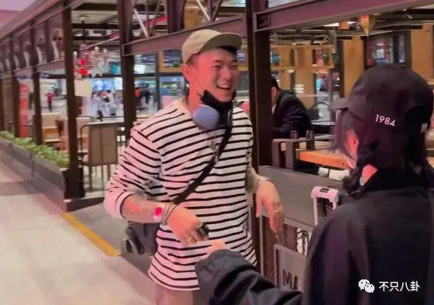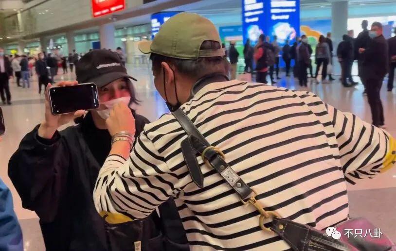 黄雅莉举着手机接机恶搞小王,小王笑得合不拢嘴。