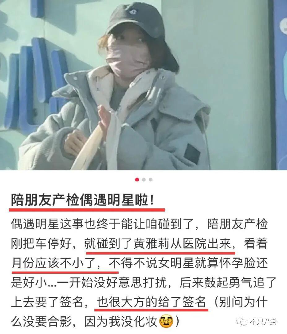 有网友发文称,在妇产医院偶遇黄雅莉产检,称其看起来 " 月份应该不小了,就算怀孕脸还是好小 "。