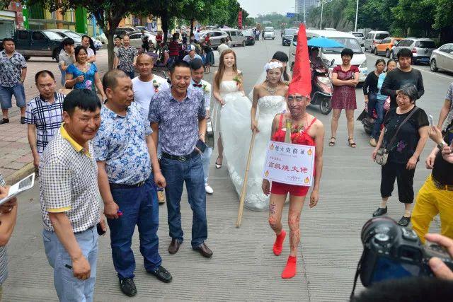 比如,新郎被朋友绑在灯柱上,屁股后面挂着鞭炮。