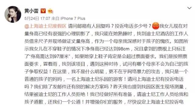 2017年5月14日,黄小蕾在社交网站发表动态,控诉自己在迪士尼遭遇的一系列委屈,还公布了工作人员的真名。