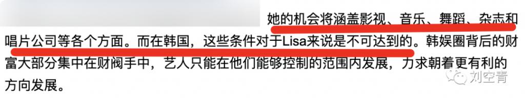 美国公司还许下承诺,让 Lisa 培养新人,这些新人也会帮助 Lisa 扩大影响力,当时 Lisa 还买了通稿,宣传这些条件她在韩国是拿不到的,顺便讽刺了一波韩国是财阀国家。