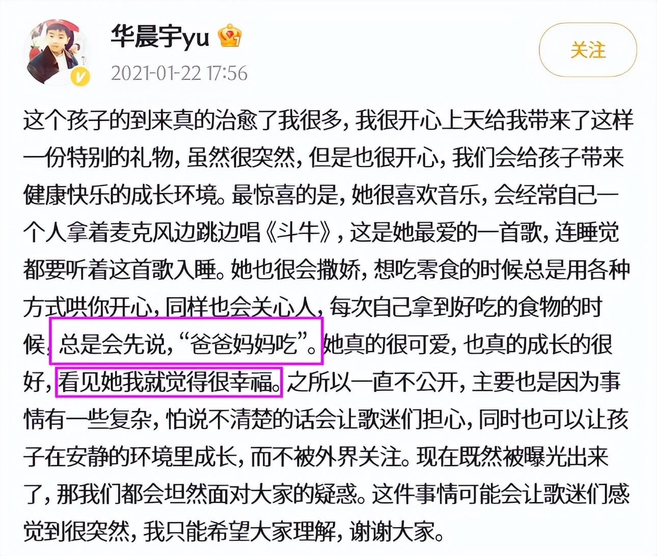 1月22日,华晨宇突然官宣“是的,我们是有一个孩子”,直接承认了传闻的真实性。