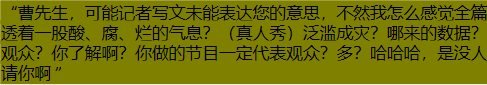 他在接受采访时表示,不知道一个资深的节目主持人为什么会这么轻易地用如此严重的,可以说是质疑他人人品的一个词去评价自己。
