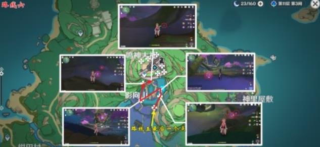 鸣神大社上面绕一圈后,注意观察最后两个点的位置。倒数第二个点的位置,是贴近山体的,在下落的过程开启元素视野,方便找寻此绯樱绣球。