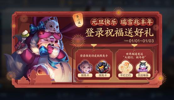 活动期间,登录游戏1次即可获得2021元旦快乐钻石礼包*1+史诗皮肤限免卡自选宝箱*1,在游戏大厅发言【大佬们,新年好】,还可得千灯之约*1+告别单身*1。