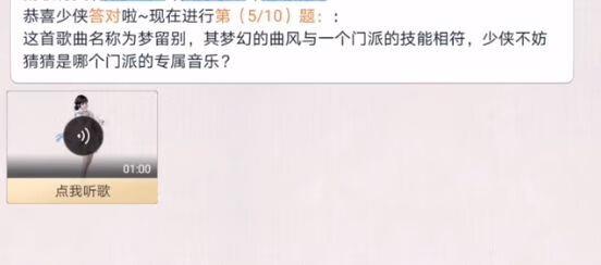 5、这首歌曲名称为梦留别,其梦幻的曲风与一个门派的技能相符。少侠不妨猜猜是哪个门派的专属音乐?
