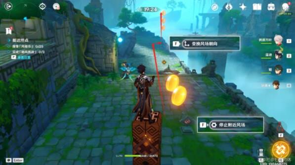 2.触碰大元素微粒,开启限时挑战,收集风元素微粒!先停止附近风场,再变换风场朝向,即可往上飞,拿到风遁币,并飞到对面平台。