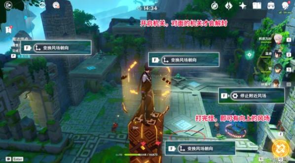 3.打完怪,出现风遁币,机关解封,出现向上的风场,飞上去,先停止附近风场,再把2个机关变换风场朝向各1次,飞到上面开启方块机关,对面的机关解封,再变换风场朝向,即可往上飞到平台。