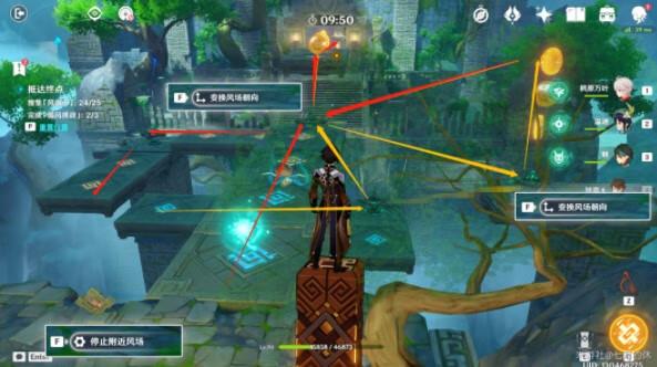 5.先停止附近风场,触碰大微粒,跟着红色箭头逆时针绕一圈,收集元素微粒,再跟着黄色箭头方向,借助机关向上风场飞上来,(如果跑的快,可以直接飞向右边),在中间的机关变换风场朝向,飞到右边,同样的操作,跟着红色箭头方向,再飞过来,然后往前走到终点即可完成台挑战!