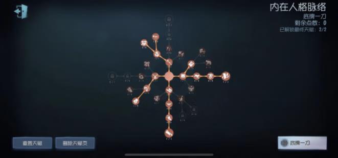 此套天赋比较通用,前期可以携带辅助特质【闪现】,配合追猎进行快速击倒,在中后期根据场上局势来考虑使用【底牌】切换成【失常】,配合降低密码机破译进度;开门战利用【报幕】的获取信息能力灵活使用【底牌】切换【传送】,配合“无效”的封门效果,在开门战掌握主动权。