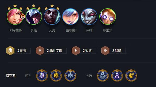 1、阵容羁绊:4刺客2学院2保镖2极客;