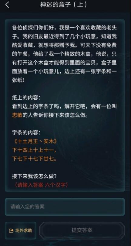 各位侦探们你们好,我是一个喜欢收藏的老头子。我的旧友最近得到了几个小玩意,知道我酷爱收藏,就想将那赠予我。可天下没有免费的午餐,他给了我一个精致的木盒,他说,只有打开这个木盒才能得到里面的宝贝,盒子里面放着一个小玩意儿,边上还有一张字条和一张纸!
