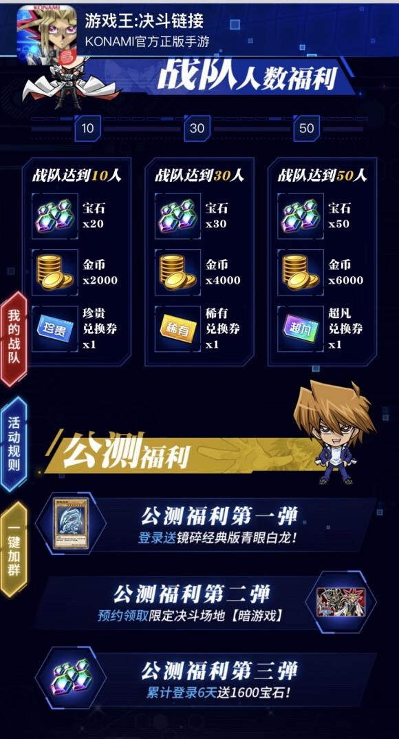 游戏王决斗链接手游已经正式上线了,游戏在公测的时候推出了公测福利奖励,很多小伙伴对于奖励还不是很清楚。下面小小编小编为大家带来游戏中关于战队奖励的详情介绍攻略,希望可以帮助到大家!