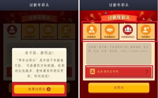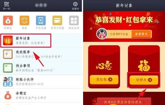 1、打开支付宝钱包,进入支付宝包首页后点击“新年讨喜”,然后点击“讨彩头”。