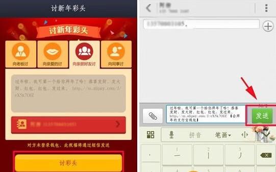 3、最后点击“讨彩头”,对方未登录钱包的话支付宝会以一条短信的形式发送给对方。