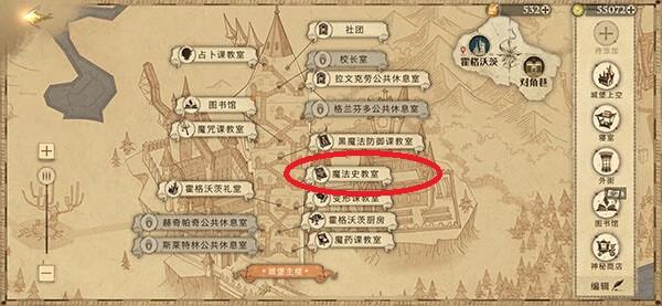 2、然后打开城堡主楼的地图,找到并且选择进入魔法史教室;