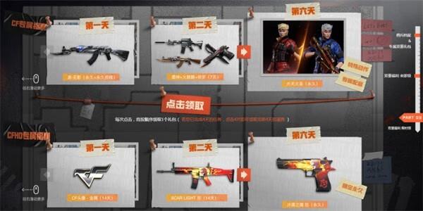 每次点击,将按顺序领取1个礼包( 若您已完成4天的任务,点击4次即可领取完前4天的道具 )