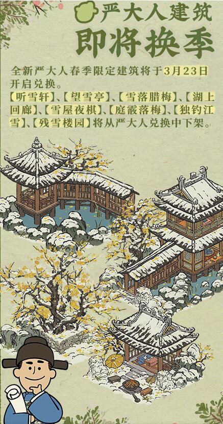 以上就是江南百景图3.23严大人建筑换季介绍了,更多精彩内容,敬请关注讲历史手游网。
