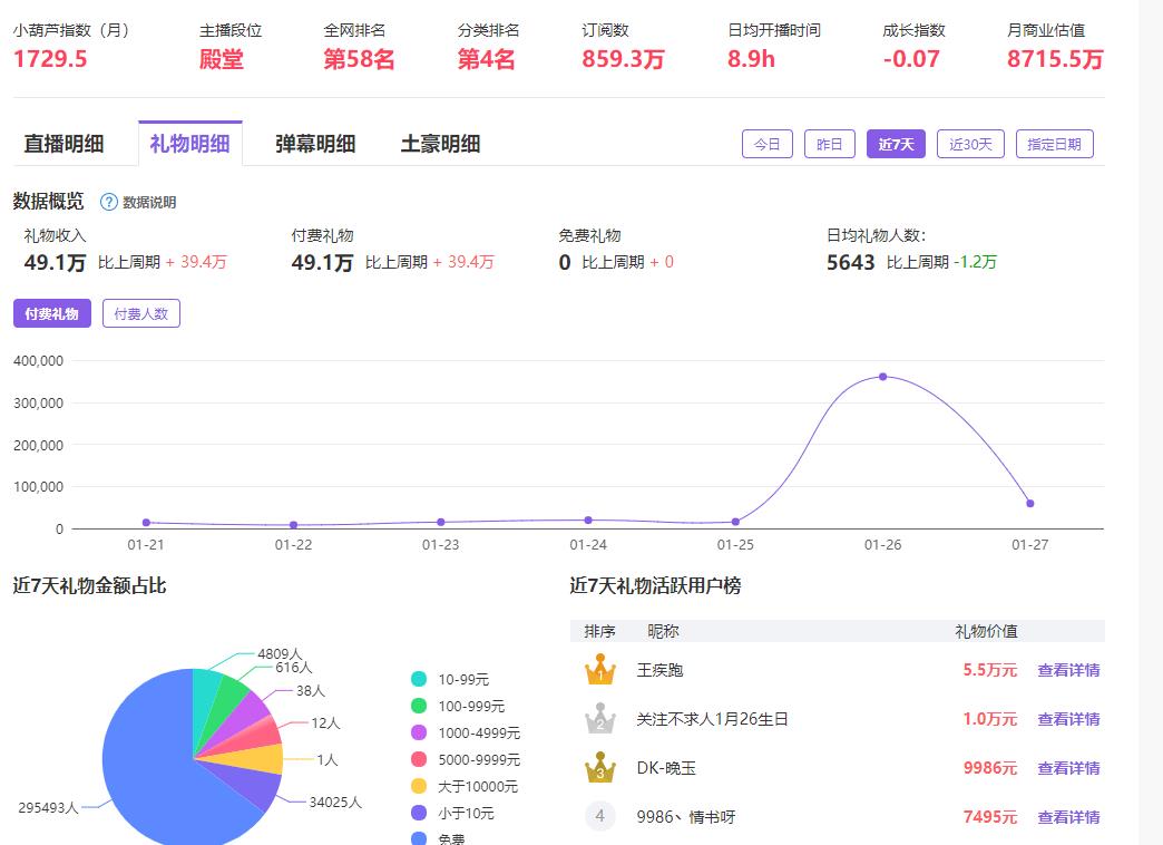 不求人在上一周完成了自己的生日会,作为和平精英人气较高的主播之一,不求人这一周是什么表现?让我们用数据说话,在平日里不求人的日均礼物收入在1.5万元左右,虽然比起绝大多数的主播来说,这已经是超级多的收入,但依旧有上升空间,在26日这一天不求人正好是自己的生日,这一天大咖云集,有不少的土豪粉丝前来送礼,而且平民观众也是十分的大方,这一天不求人获得了36万的收入,一举成为了当天仅次于虎牙张大仙的“销售冠军!”