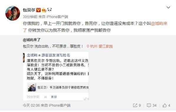 没过多久,网友在微博晒出的朋友圈爆料截图就被包贝尔看见了,包贝尔瞬间被激怒,他转发网友的微博澄清,并回怼网友称:“你信我的,早上一开门我就告你,告死你,让你造谣没有成本?这个叫XXXX 你转发你以为我不告你,我倾家荡产我都告你”。