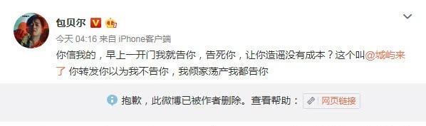 被包贝尔点名怒怼的微博网友很快就删除了微博,网友们也纷纷留言力挺包贝尔:“支持包贝尔!对付这种人就要死磕到底 你是真爷们!”“删微博也没有用啊”“支持!必须告他!最讨厌造谣的人”。