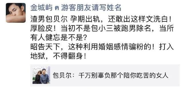 有网友在朋友圈转发文章配文称包贝尔是渣男,称包贝尔在包文婧孕期内出轨,不要脸的出这种洗白文,还称包贝尔是因为包养小三才被跑男除名,怒斥包贝尔利用婚姻感情欺骗粉丝。