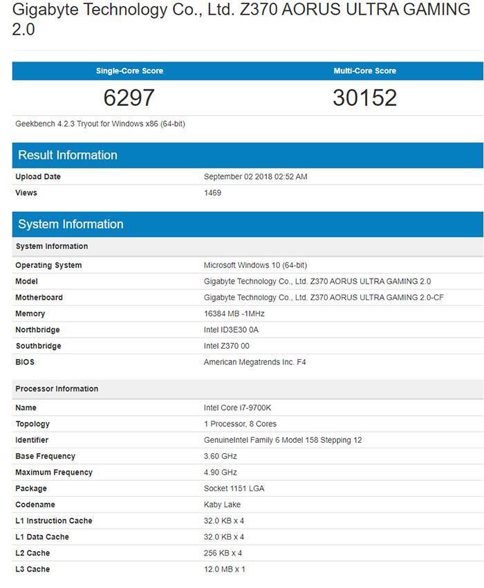 从上传的结果来看,直接识别了Core i7-9700K的型号,基础频率3.6GHz,加速频率4.9GHz也对得上,12MB L3缓存,使用的主板是技嘉Z370 Ultra Gaming 2.0版,搭配16GB内存,单核跑分6297分,多核跑分30152分。