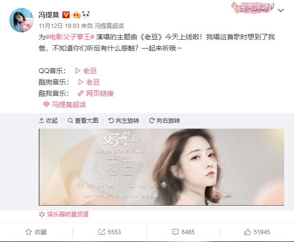 最近冯提莫的新歌《老豆》已经在各大音乐互联网平台上线,上线首日就受到了网友的认可,也是好评如潮。这是即将上映的《父子拳王》主题曲,一部电影的主题曲是非常重要的,而冯提莫能胜任电影主题曲的演唱歌手,也是反映出了冯提莫扎实的唱功底蕴!