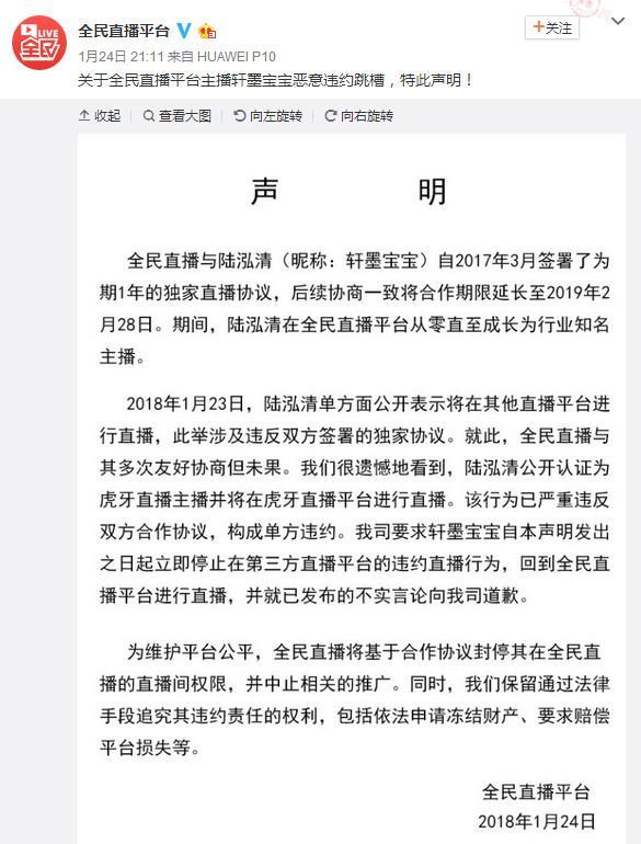并且在昨天,全民直播发出对轩墨宝宝恶意违约跳槽发出声明警告,对于这件事,很多网友都有很多的猜测.